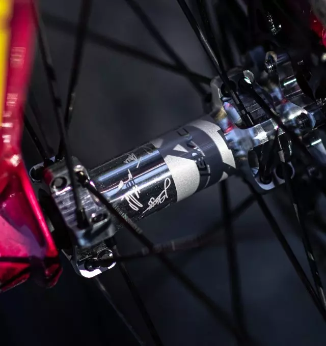 Vous retrouverez, sur le moyeux, les signatures au laser des athlètes Specialized de l'équipe Factory Racing.