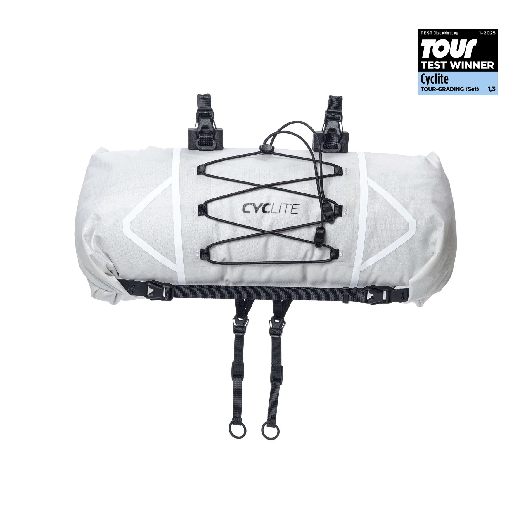 Pensée pour le bikepacking rapide, la Cyclite Handle Bar Roll Bag / 01 offre un volume 12,6 L compressible avec fixation 4 points pour une tenue irréprochable, même sur cintres route étroits.